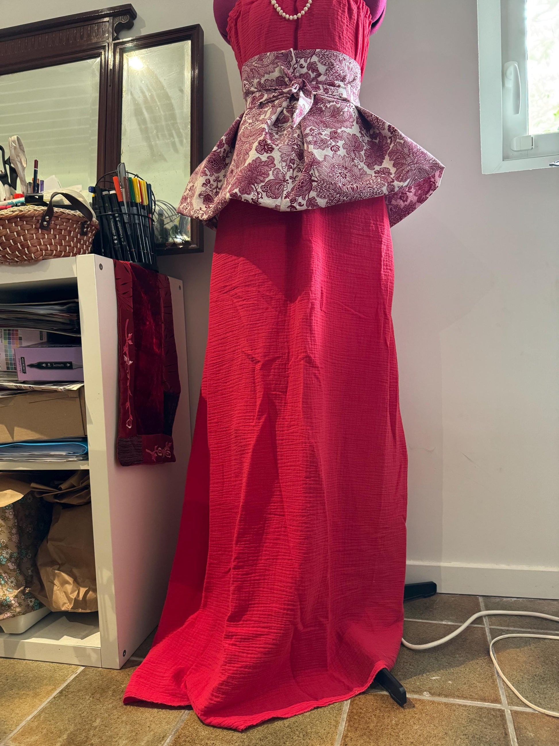AUDACE - Rubis robe longue bustier rouge bordeaux avec ceinture.