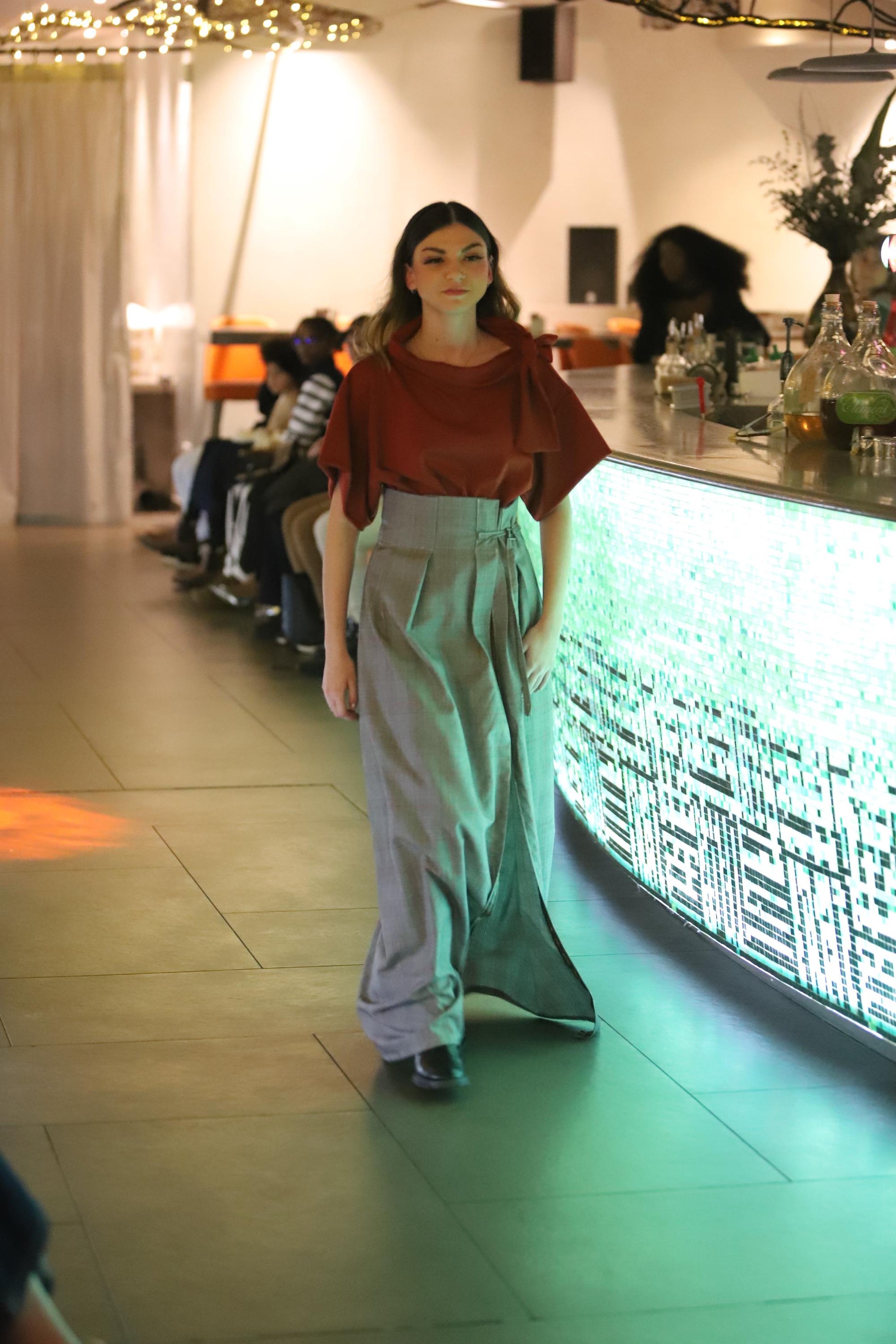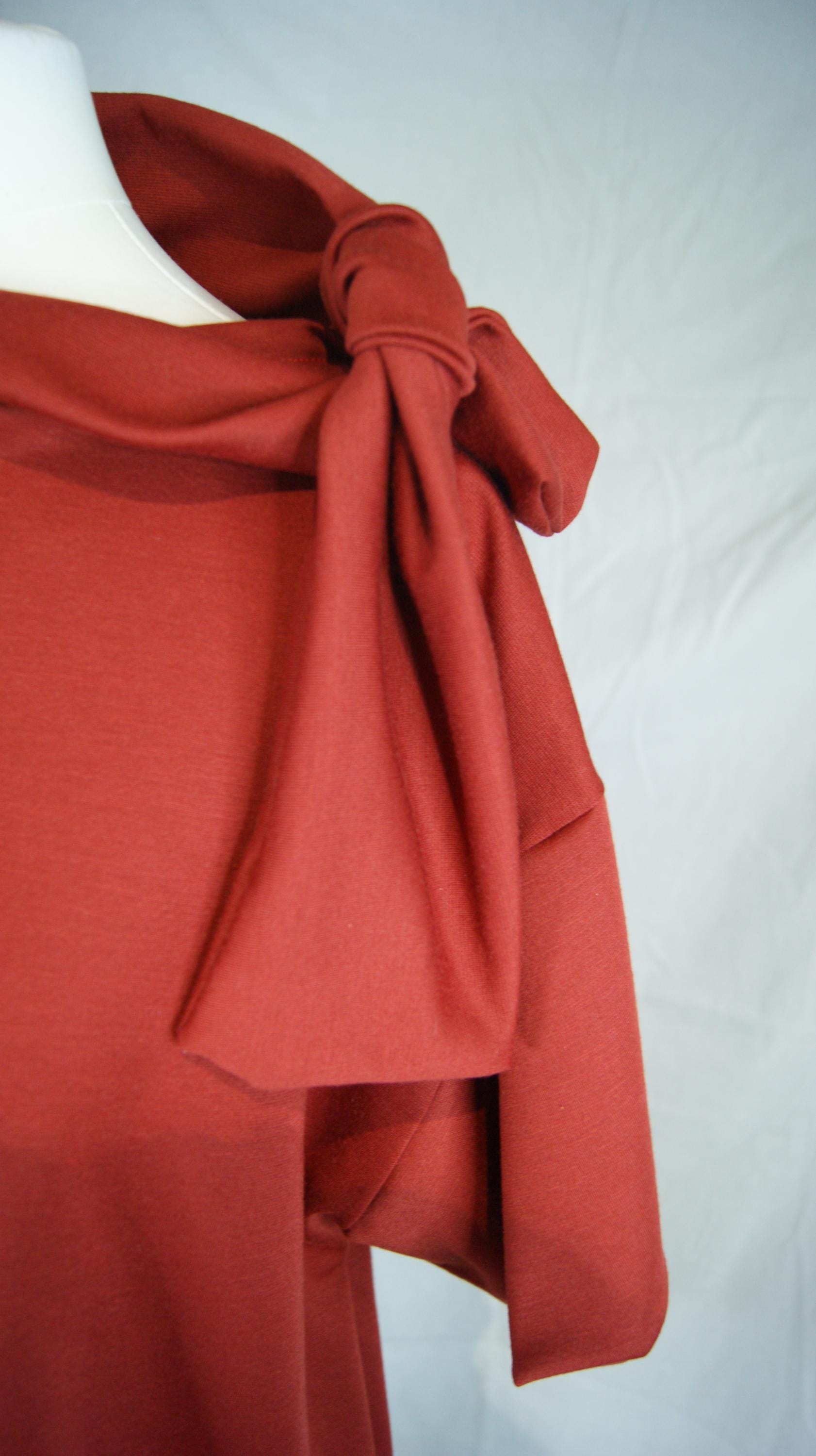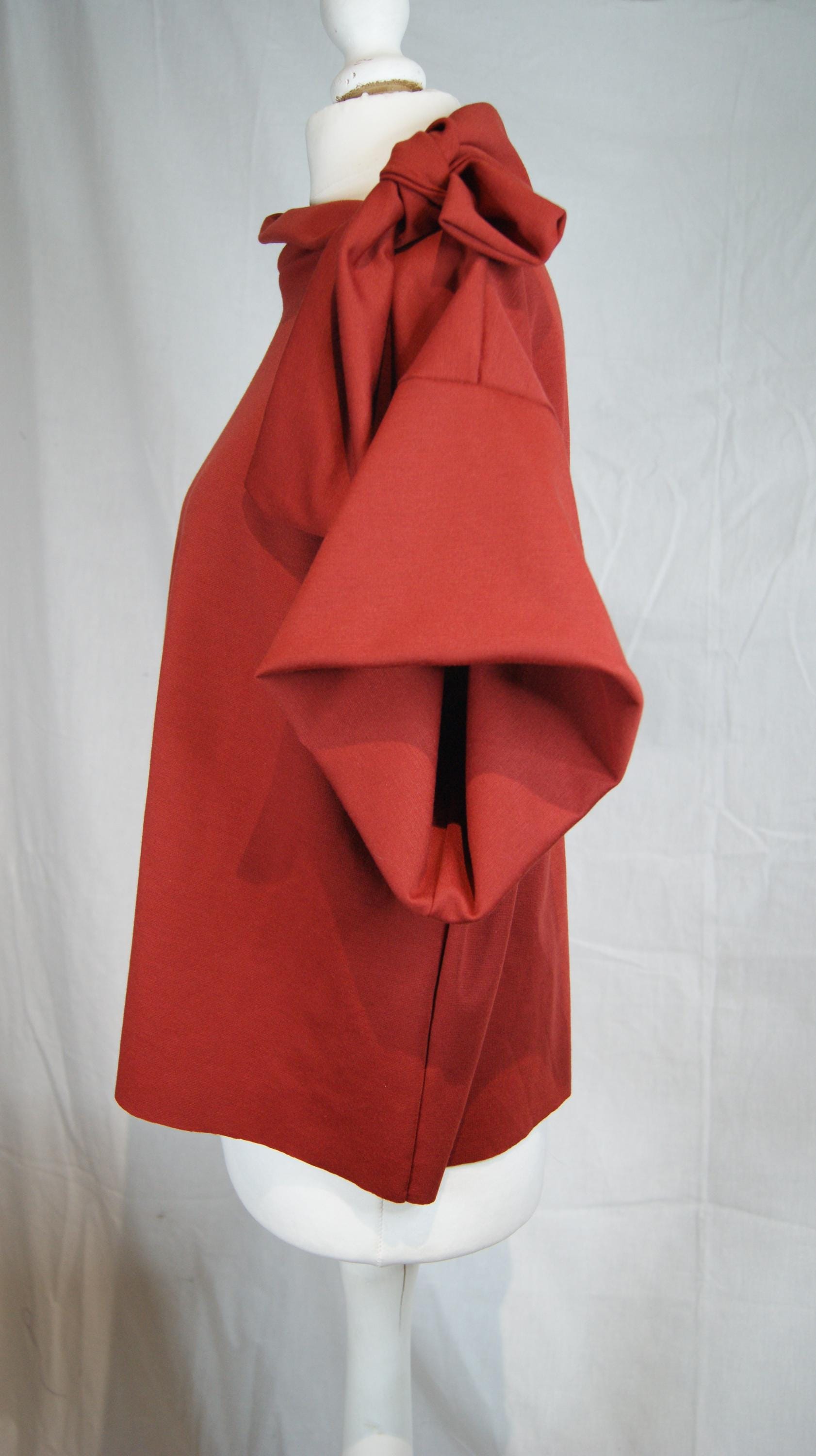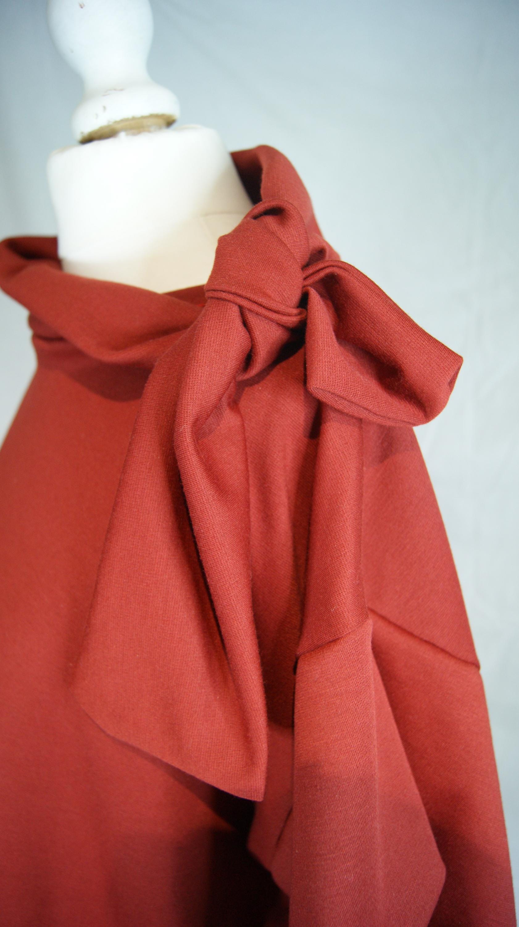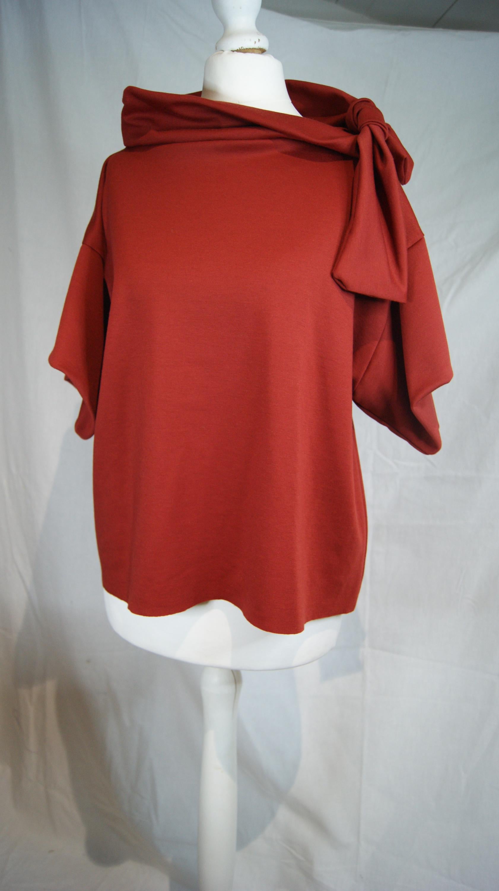 Carla est un haut avec des manches oversize et un col qui se noue sur le côté en maille milano rouge terracotta.