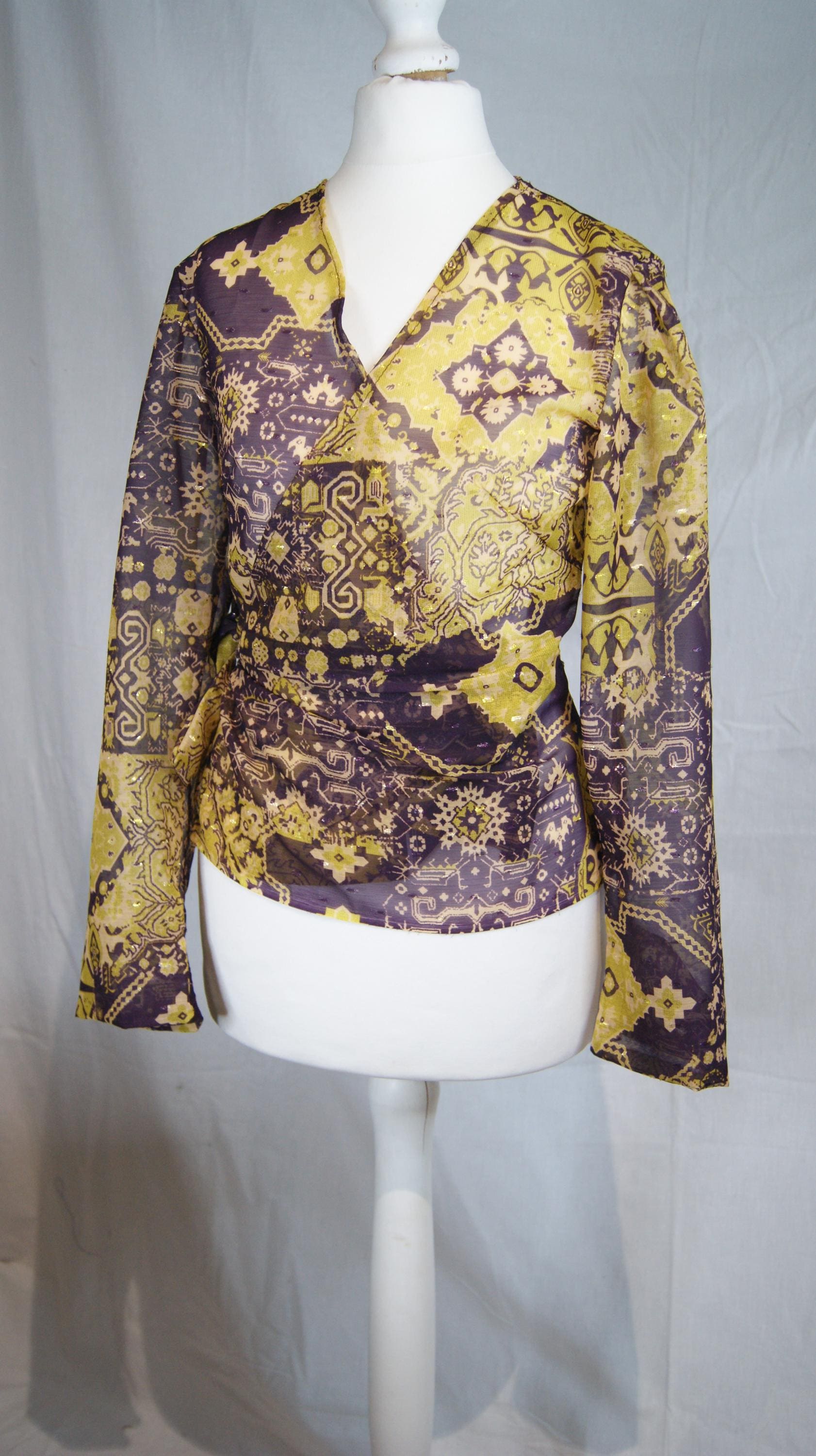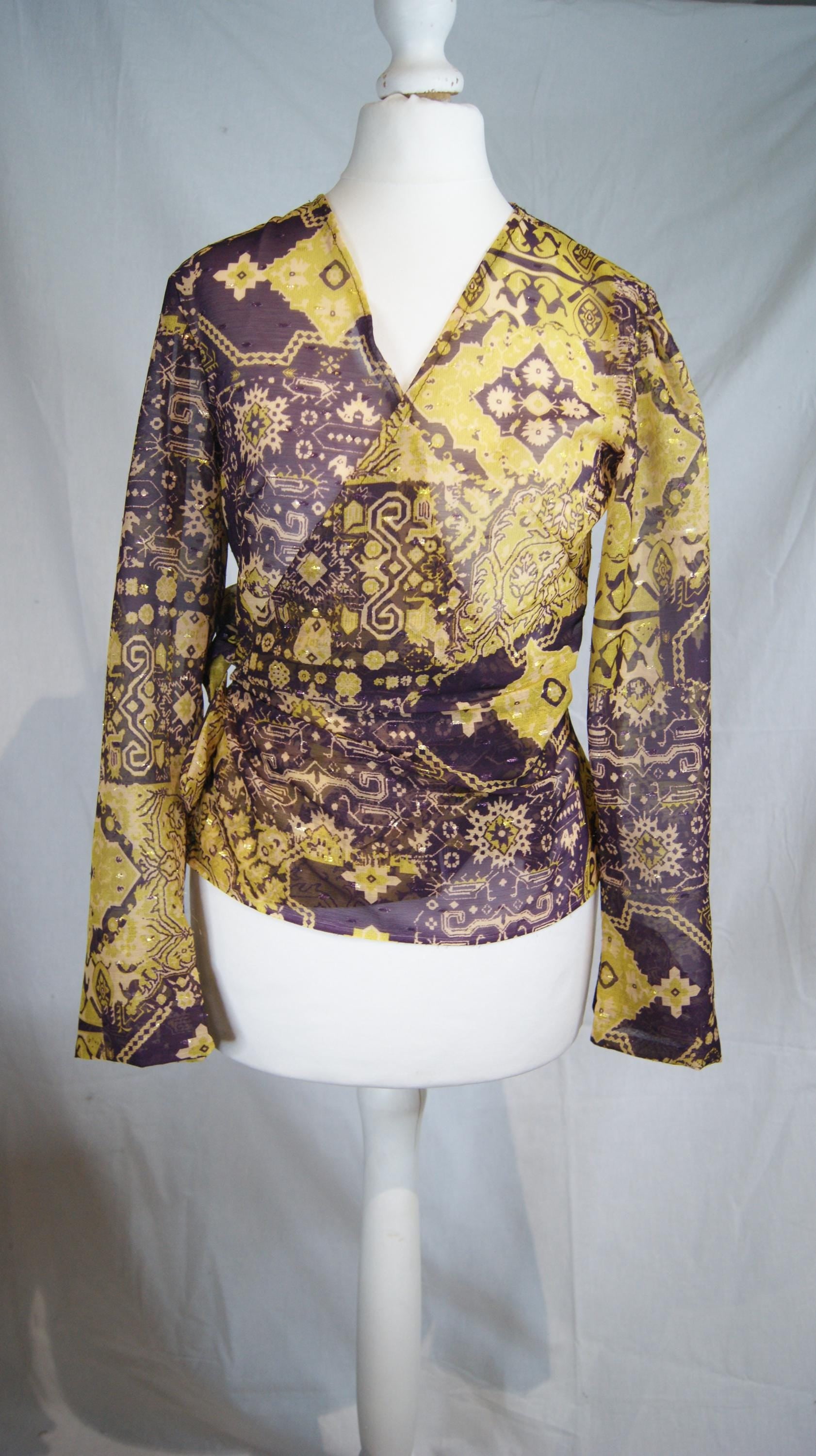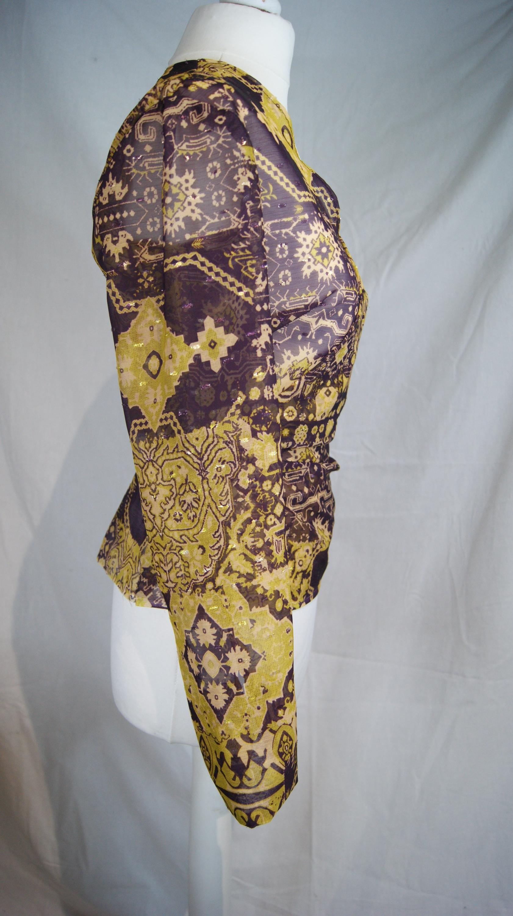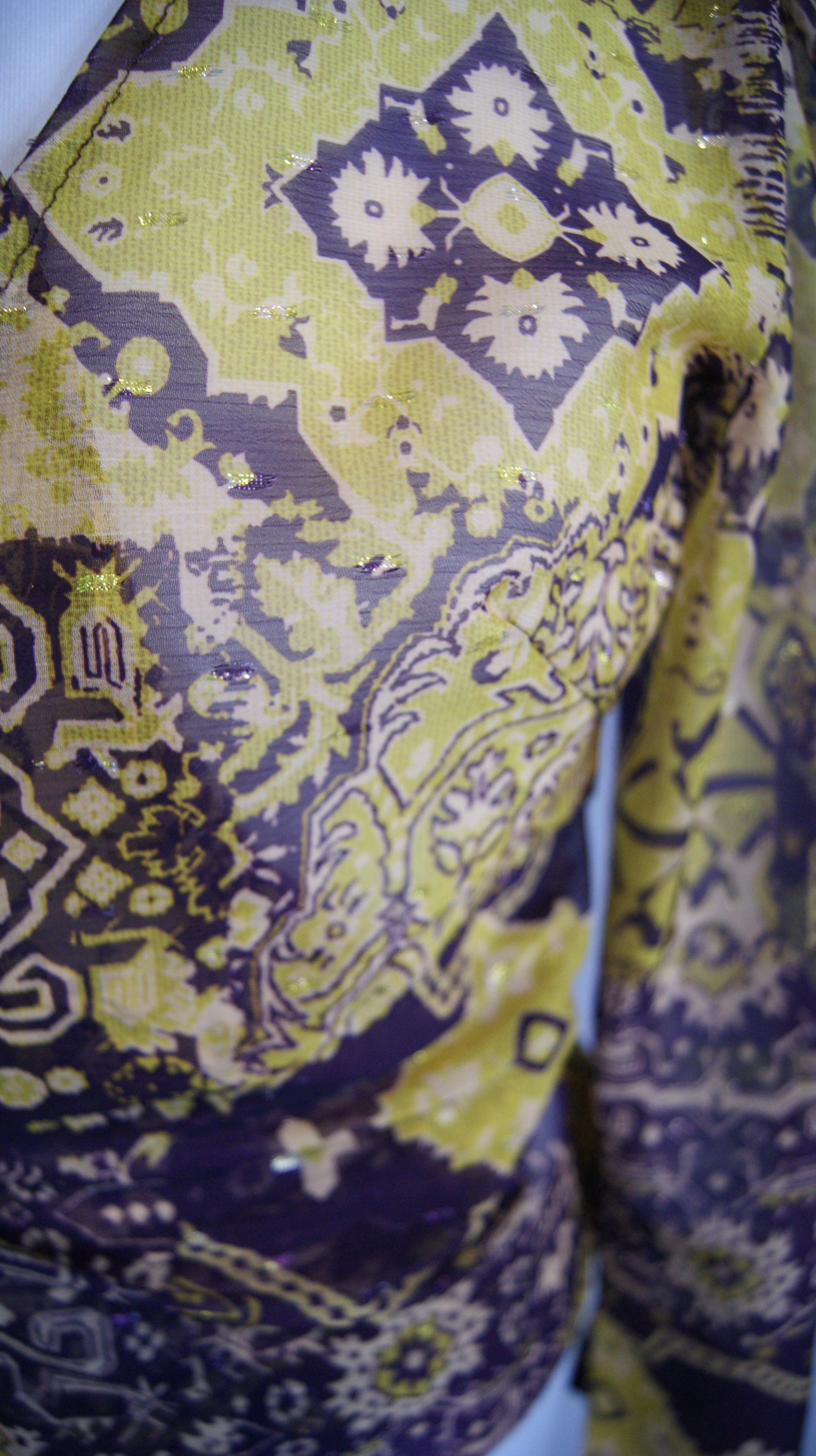 Orphée est un chemisier porte feuille en organza. La transparence y est subtile et les ornement violet et doré y sont avec beaucoup de goût.