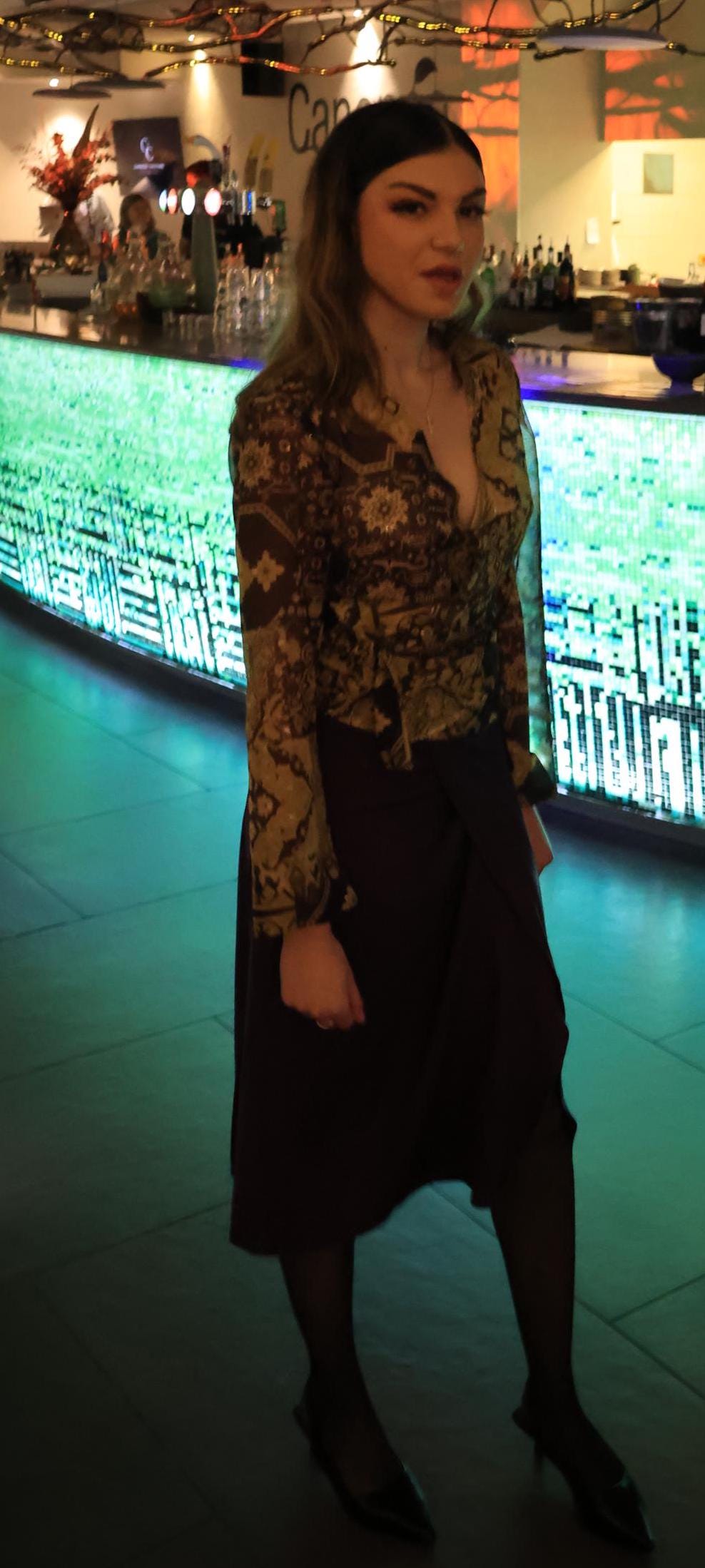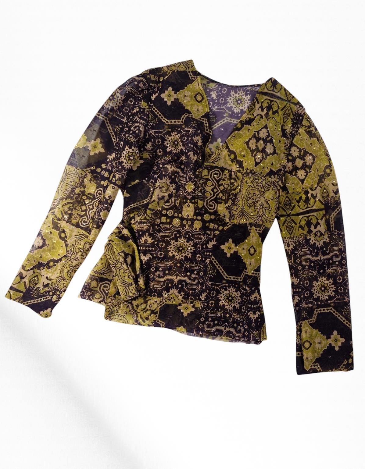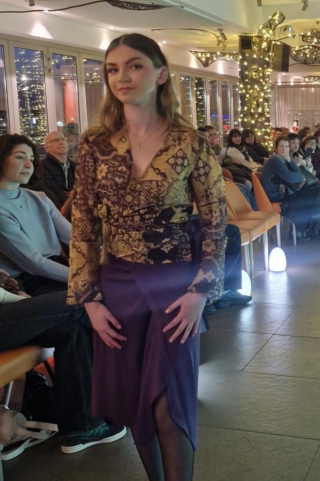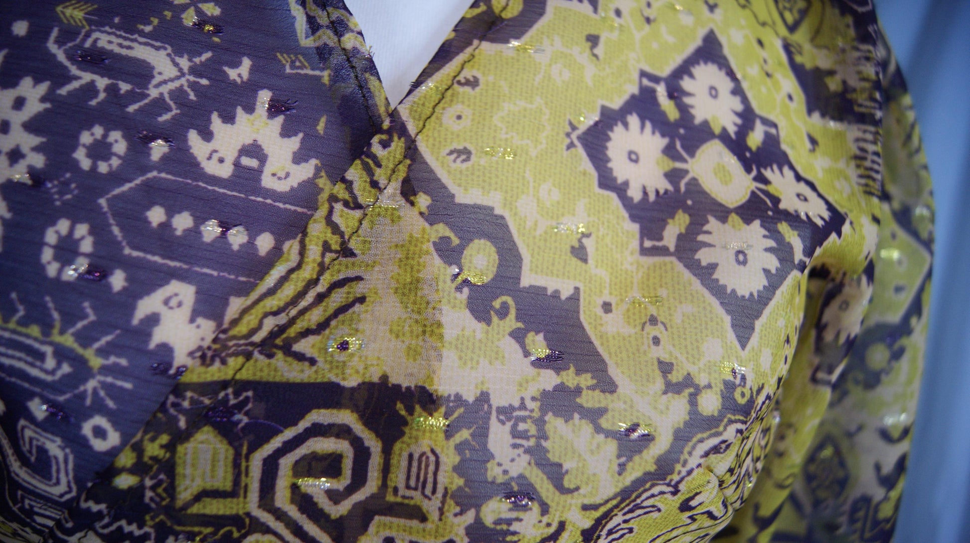 Orphée est un chemisier porte feuille en organza. La transparence y est subtile et les ornement violet et doré y sont avec beaucoup de goût.